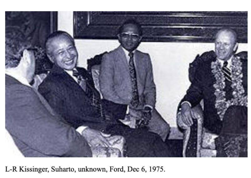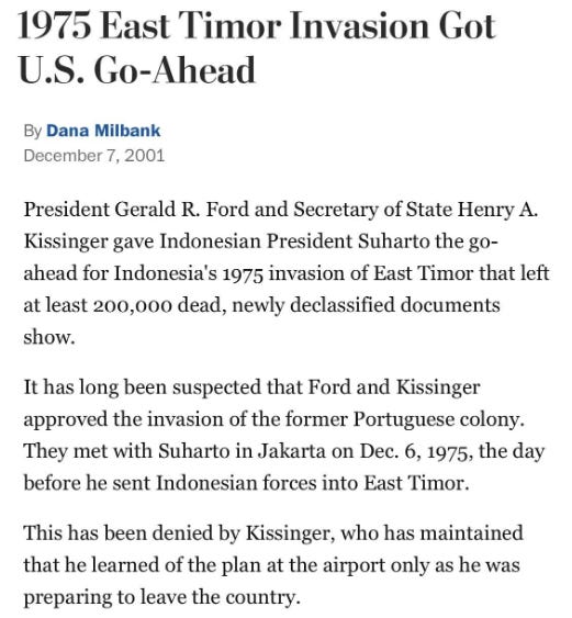 Among the long list of things Kissinger did in Southeast Asia: He gave Suharto the go-ahead to invade Timor Leste / Timor Timur / Timor Loro Sae, led by [commander] Prabowo Subianto Djojohadikusumo as chief of [special force unit for Timor Leste issue] SEROJA GROUP / SEROJA FORCE— now Presidential candidate again in Indonesia, launching a bloody civil war that left as many as 200,000 dead. For years after, even after Timor Leste gained independence, Kissinger denied his role.