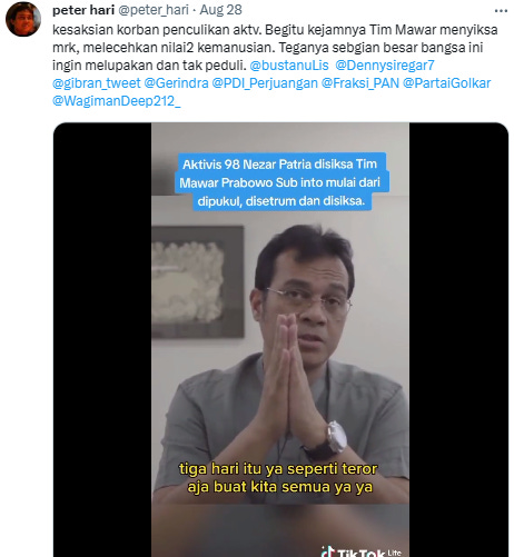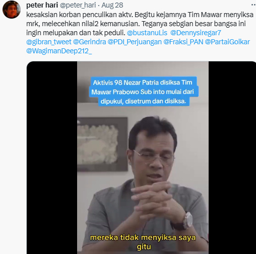 Mas / Mister Nezar Patria is a former activist, and was part of [or victim] abductions of pro-democracy activists which happened between the 1997 Indonesian Legislative Election and the fall of Suharto in the 1998 / May 1998 riot.