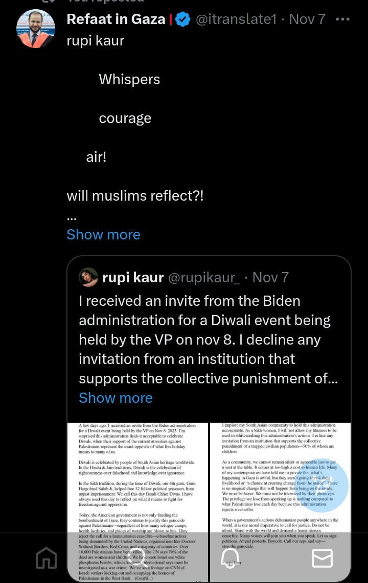 Refaat Alareer after acknowledge that Rupi Kaur refused Divali’s White House party by Biden.