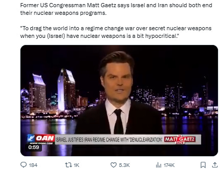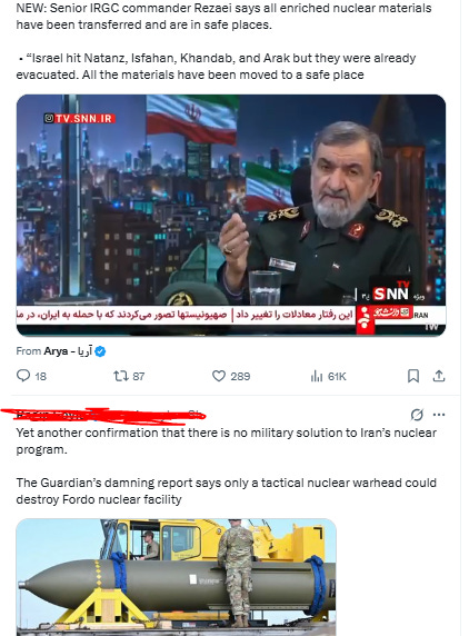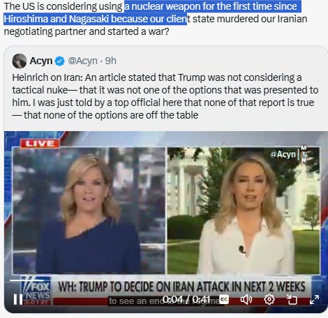 God sake. For pro zionist or Israel backer, in less than a week, they’ve gone from “Israel’s surprise attack to stop nuclear development was a stunning success” to “the U.S. needs to drop bunker busters on Iran because the attack didn’t work” to “the Iranian regime needs to go” to “America needs to do the regime change” to “actually we need the U.S. to nuke Iran because the bunker busters won’t work.”