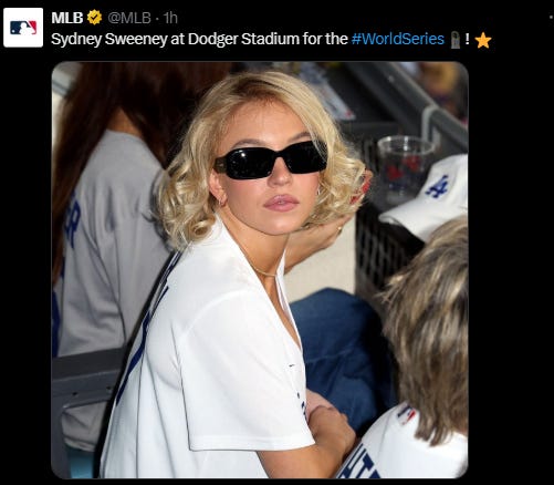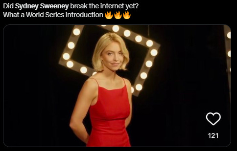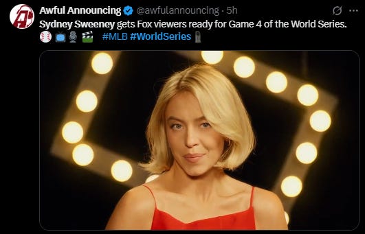 If Sydney Sweeney in a Marilyn Monroe blonde wig and little red dress out of how to marry a millionaire opens the fox broadcast of game four, will be exciting who for game 5 [chose] by the fox.
