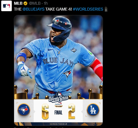 Wild 18 innings game last night ended 0.09am Los Angeles, after 6 hours and 39 minutes. But Game 4 ended too fast, and Dodgers looks tired. Toronto Blue Jays won, in only 2 hour 27 minutes. Blue Jays won 6-2, series tied 2-2, game ended 8.27pm Los Angeles. Don’t forget, Blue Jays will play at least one more home game in this #WorldSeries