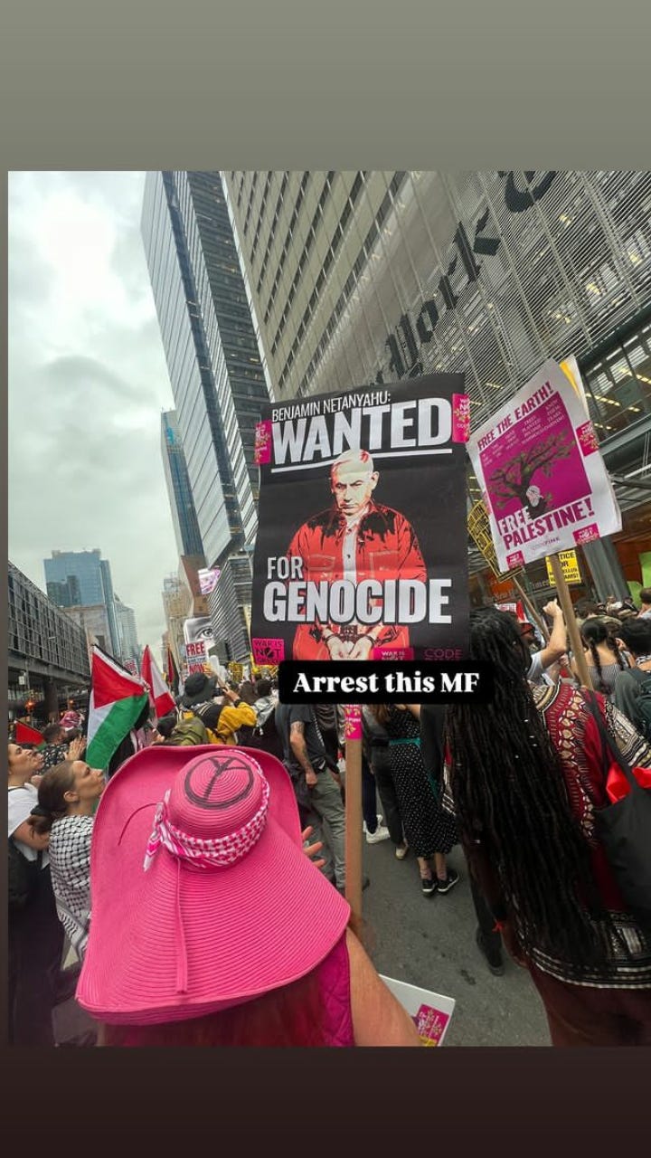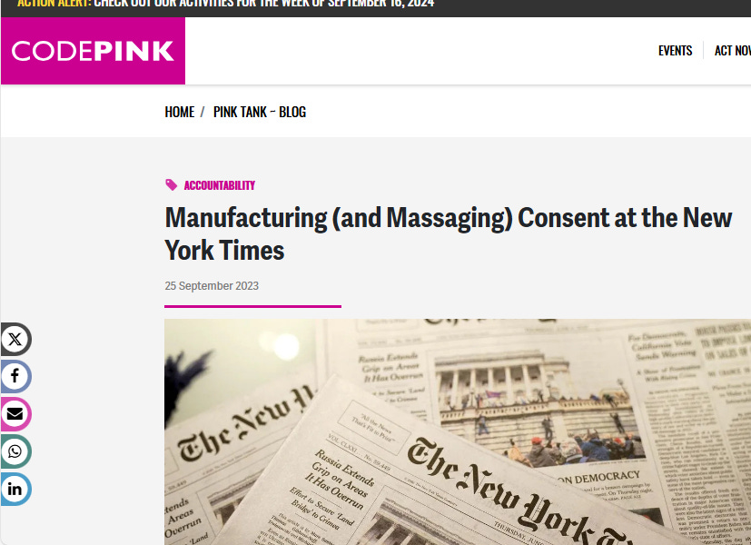 Jodie Evans Jodie Evans, co founder CODEPINK Alert CODEPINK’s Newsletter alongside Medea Benjamin Medea’s Substack , outside NYT headquarter.