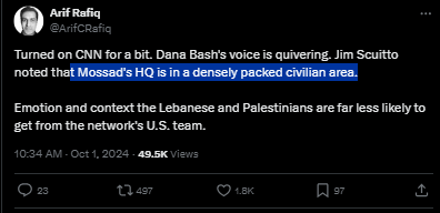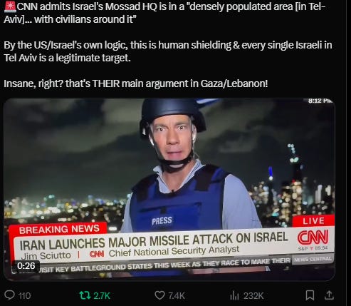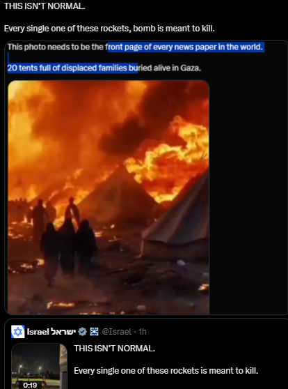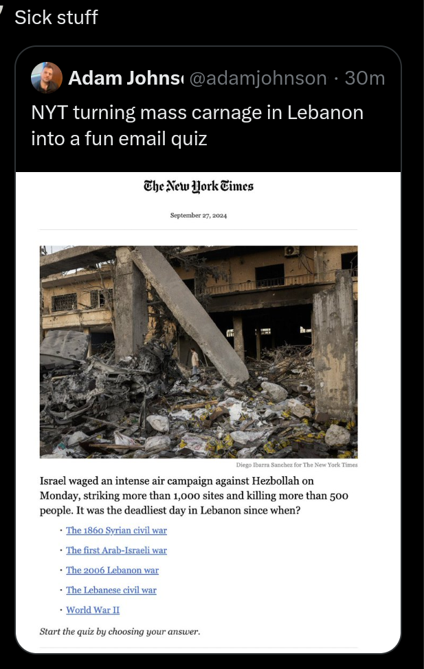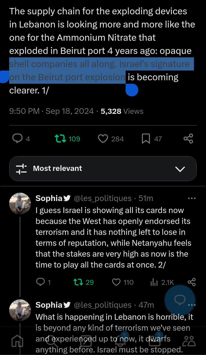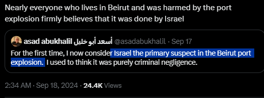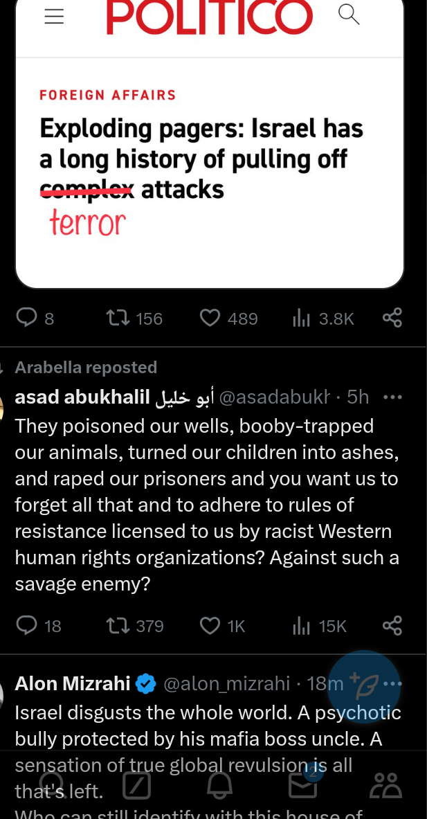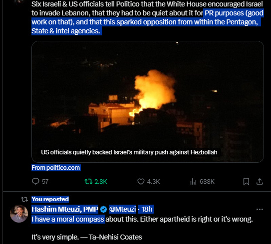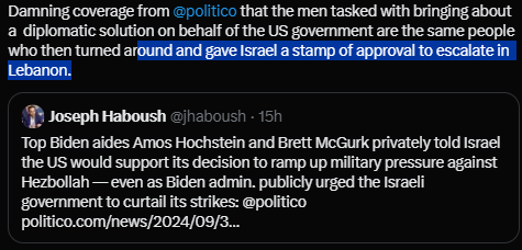 Tel Aviv is thrumming with “birth pangs of a new Middle East” energy and that should terrify everyone. Maybe Tel Aviv is hub of [real] satan. No getting around the fact that the Biden administration’s feckless, dead-end approach to Israel has brought us, entire world to this unbelievably dangerous juncture. Regional War, maybe World War 3. Speak out against Russia’s invasion of Ukraine but awfully silent about Israel’s invasion of Lebanon? Might want to check the old moral compass to see if it’s still working. Watching Israel’s shock and awe bombardment of south Beirut, Gaza, Yemen, Syria in same hour, remember that Israel is not a superpower and is incapable of staging such an operation on its own. Israel can only undertake this war with weapons and aid provided by the US, assistance that Biden has kept flowing.