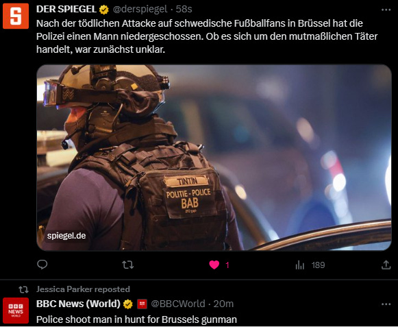 After 13.5 hours under terror, maybe ‘politie’ [local police] already secure the situation. Police in Brussels have shot a man in a massive manhunt for the gunman who killed two Swedish nationals on Monday evening. Tunisian national, has been ‘neutralised’ by police.