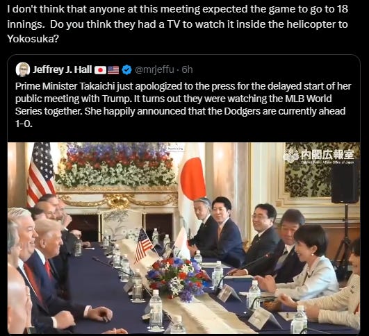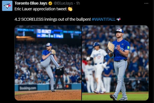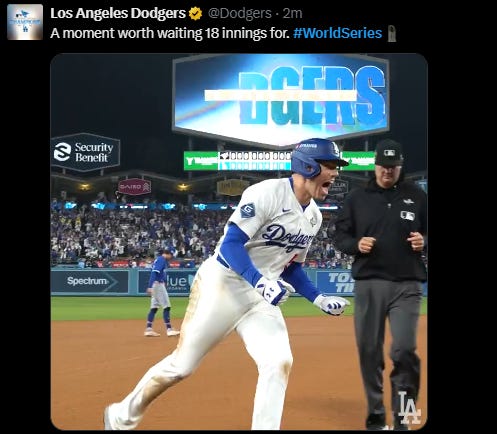 Absolute Cinema. 18 Innings, almost 7 hours [6 hours and 39 minutes], game 3 of Toronto Blue Jays v Los Angeles Dodgers. Dodgers won 6 - 5.