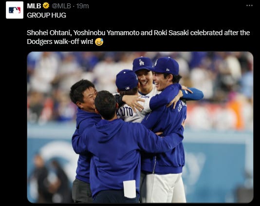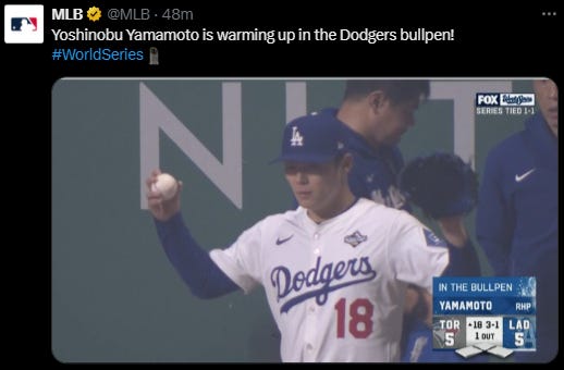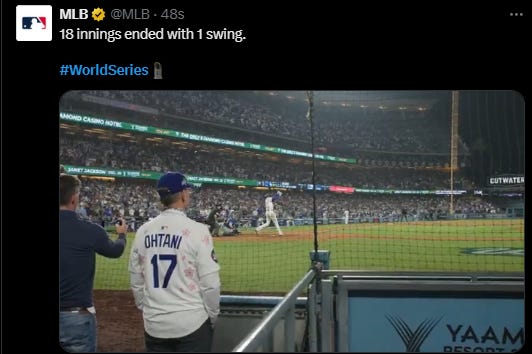 But even Dodgers was extremely nervous to the game, and make Yoshinobu Yamamoto warm up at bullpen, if, if scenario will be 20 or 21 innings. Extremely nervous because in Game 3, Dodgers Shohei Ohtani seems “unfit” in the entire [almost] 7 hours even though also got home run. Shohei Ohtani joins 1956 Yogi Berra as the only players in World Series