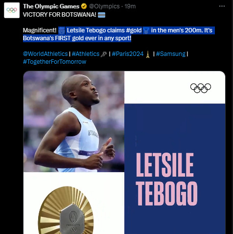 And around 2 hours before Rizki Juniansyah won Gold medal, not Caribbean but Africa, Botswana Letsile Tebogo claims gold in the men's 200m. It's Botswana's FIRST gold ever in any sport.