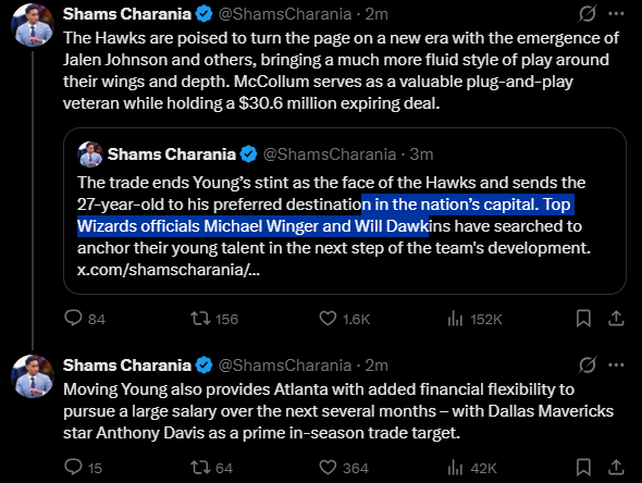 Finally after brouhaha in months inside Hawks. Wizards are trading CJ McCollum and Corey Kispert to the Hawks in return for Trae Young