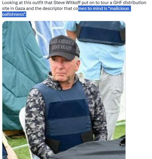 [A real estate investor-turned-diplomat donning urban camo, a kevlar vest, and a gray-scale MAGA hat to visit what is ostensibly supposed to be a site to distribute humanitarian aid. Stunt within a stunt]