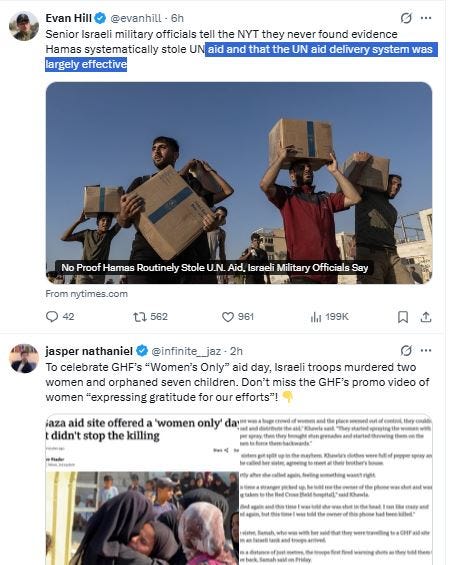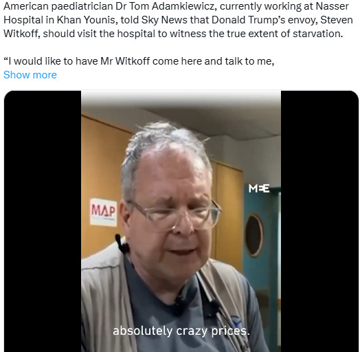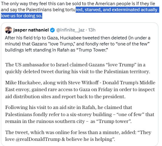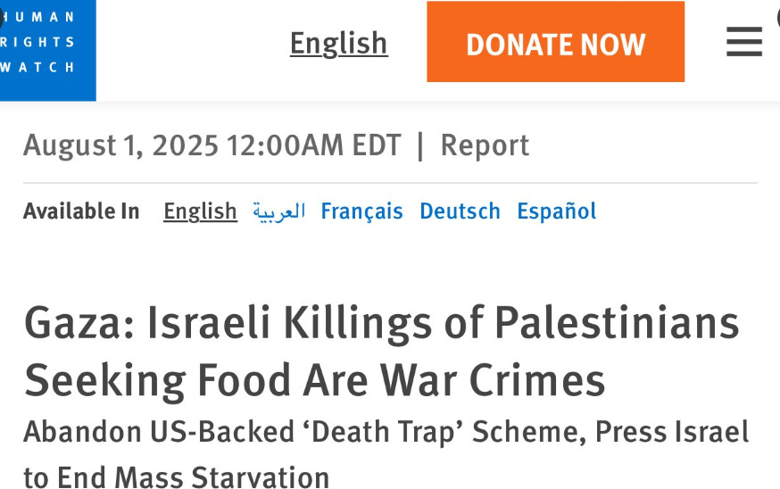 Human Rights Watch published a report [August 1st] saying Israel’s intentional deprivation of aid amounts to the crime against humanity of extermination and acts of genocide. Naturally there is no media coverage, because why would this be newsworthy?