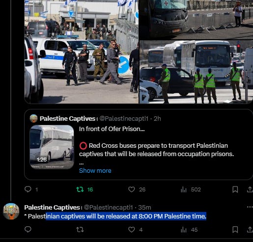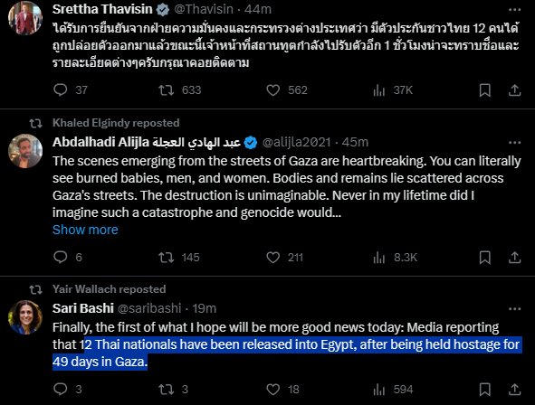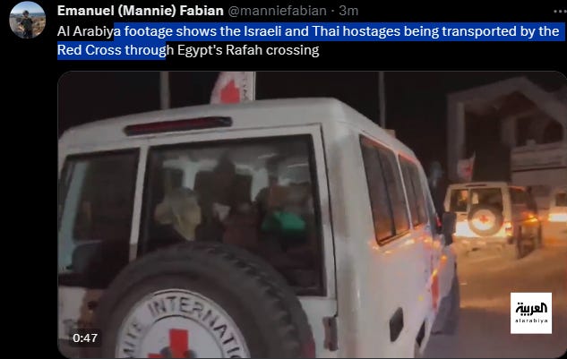 Thailand PM Srettha Thavisin already confirmed that 12 Thais already in Egypt side, freed. 12 Thai workers were handed over to the Red Cross in Rafah Border. At the moment this newsletter landed in your inbox, Thai hostages are meeting with Shin Bet personnel in Egypt side, in Rafah Border. The 13 Israeli hostages have been handed over to the Red Cross in Gaza, also meeting with Shin Bet.