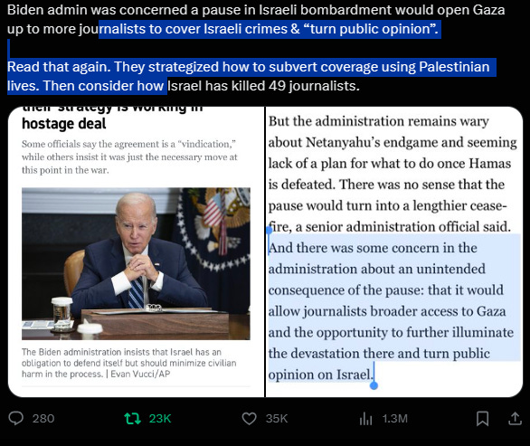 Indeed, over the years, Israel has detained hundreds of people, including dozens of journalists, for security concerns that amounted to nothing more than social media posts. And since October 7, Israeli forces have been aggressively policing what Palestinians are saying online. Tala Naser, a lawyer at the Palestinian prisoner and human rights organization Addameer, told me that even social media posts that merely include Palestinian flags or quotes from the Quran are being targeted by Israel as sources of incitement.