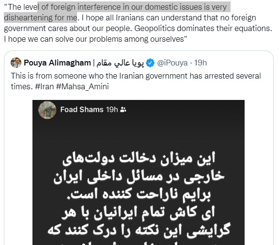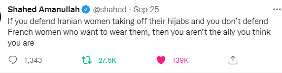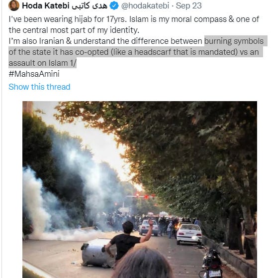 Apa yang terjadi dalam 6 hari terakhir pasca wafatnya Mahsa (*wanita yang koma dipukuli polisi Iran karena memakai jilbab kurang rapat dan akhirnya wafat) menjadi kasuistik lain: polar kubu antara pro terjaganya konservatisme di Iran (yang juga amat masif, tapi tidak diliput media), dan yang anti rezim dan atau secara terang-terangan melepas jilbab sebagai protes (yang diliput media). Menurut Aljazeera sudah 41 warga Iran wafat, tapi sumir detil seberapa banyak 41 yang wafat itu laki dan yang perempuan.
