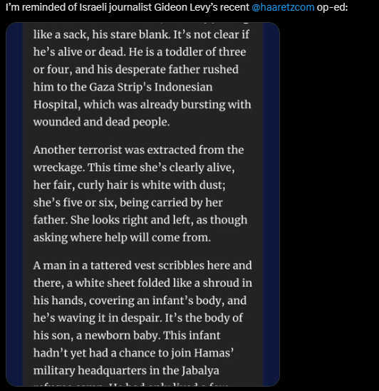 Victim who is able to articulate situation of victim has ceased to be a victim: he or she has become a threat. Whole world is ringing telling Israel to stop, Israel answe by intensifying bombing.