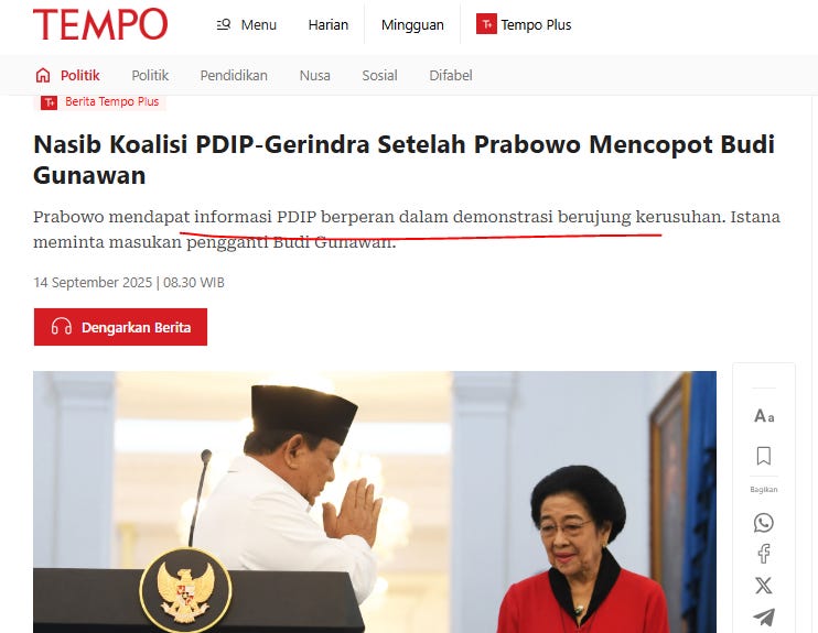 As appeared in social media, Prabowo just read a proposal so called 17+8 handed out by multiple editor-in-chief [especially, direct handed by Najwa Shihab]. Prabowo seems to underestimate the gravity of the problems he’s facing. He’s making policy like someone who just suffered a cardiac arrest but decides to drink Tolak Angin and get a coining massage, believing it’s just a common cold. Prabowo, the fact, ….. go abroad again last Wednesday to Qatar, and back again to Indonesia Thursday night.