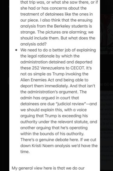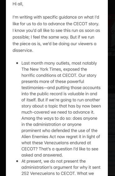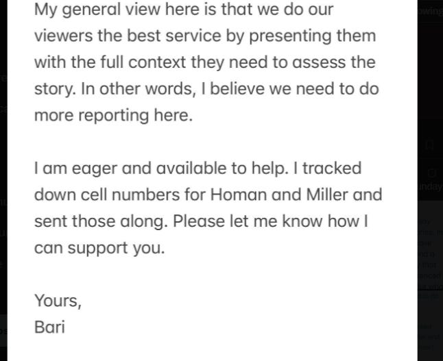 In her note, Ms. Alfonsi said that her team had requested comment from the White House, the State Department, and the Department of Homeland Security. “If the administration’s refusal to participate becomes a valid reason to spike a story, we have effectively handed them a ‘kill switch’ for any reporting they find inconvenient,” Ms. Alfonsi wrote.