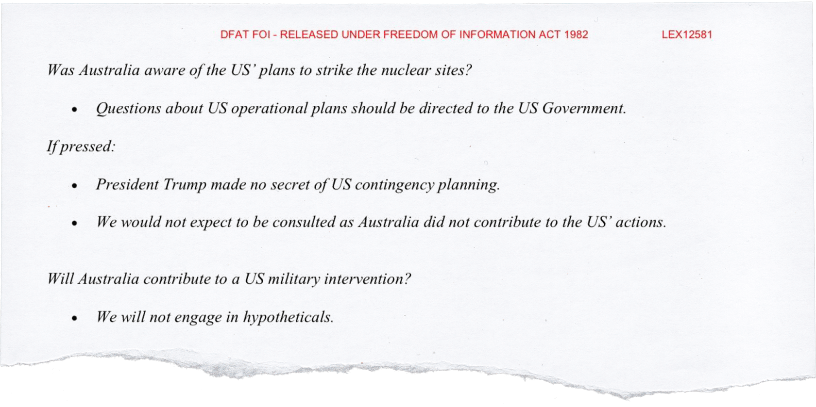 Officials first proposed an indirect answer: “Australia has been clear that Iran’s nuclear weapons program is a threat to global peace and security, and the security of the region. Australia continues to urge all parties to prioritise de-escalation, dialogue and diplomacy.”