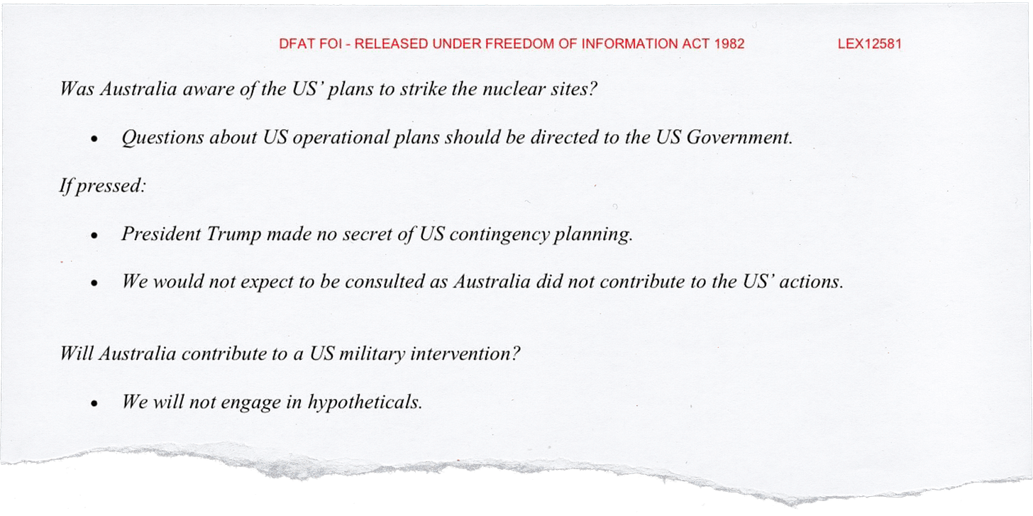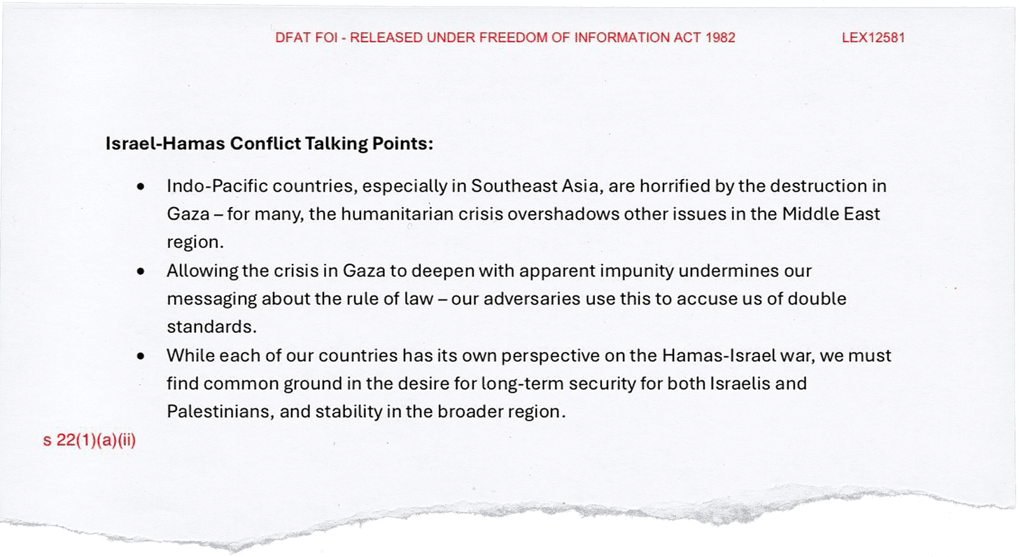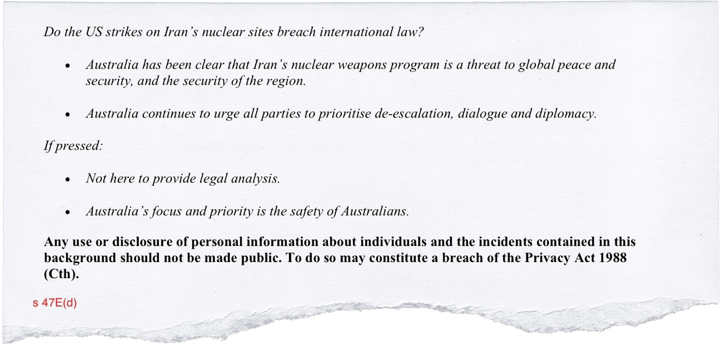 The document in question was produced by DFAT officials, but its exact purpose has yet to be clarified. It must have been produced after 24 June, 2025, given that the same page refers to Australia welcoming the Israel-Iran ceasefire.