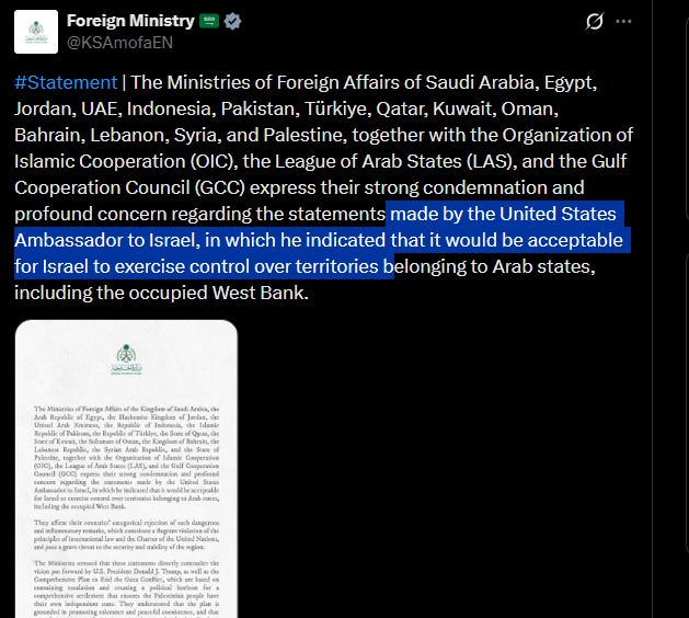 More than a dozen governments such as Saudi Arabia, Egypt, Jordan and the United Arab Emirates condemned the comments in a joint statement Saturday, calling Huckabee’s assertions “dangerous and inflammatory” as well as directly contradictory to Trump’s plans for the Gaza Strip.