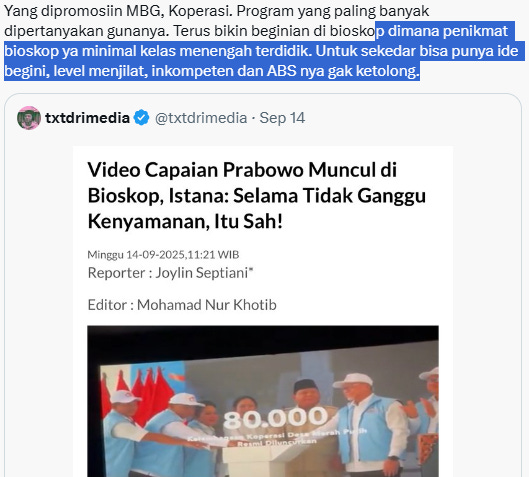 Timing of [stunning] budget for “Koperasi [village cooperatives] is coincidental with government’s decision to screen a video highlighting President Prabowo Subianto’s program achievements in movie theaters [XXI, biggest movie theater chain in Southeast Asia, owned by Sudwikatmono, long-time ally of Titiek Soeharto, ex wife of Prabowo], describing it as part of public communication efforts.
