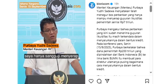 Finance Minister Purbaya Yudhi Sadewa last week deposited 200 trillion rupiah ($12.2 billion) of government funds with five state banks, saying it was to be used for lending.