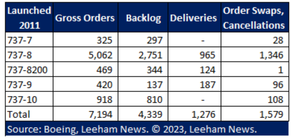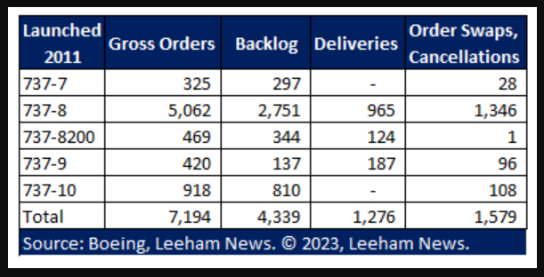 Boeing doesn’t break out the swaps or the aggregate cancellations. But it is public knowledge that, for example, Southwest Airlines swapped some 737-7 orders for the larger 737-8. We also know that when the 737-10 program was launched in 2013, United Airlines swapped 737-8 and 737-9 orders for the 737-10. During the extended, 21-month grounding of the MAX, we know that Air Lease Corp. swapped some MAX orders for 787s.