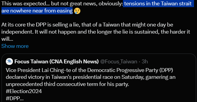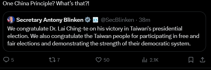 President-Elect Ching-te has been a Major Supporter of Full Taiwanese Independence from Mainland China unlike his 2 opponents in this Election who were both in support of ‘Closer-Ties’ and eventual Reunification with Beijing.