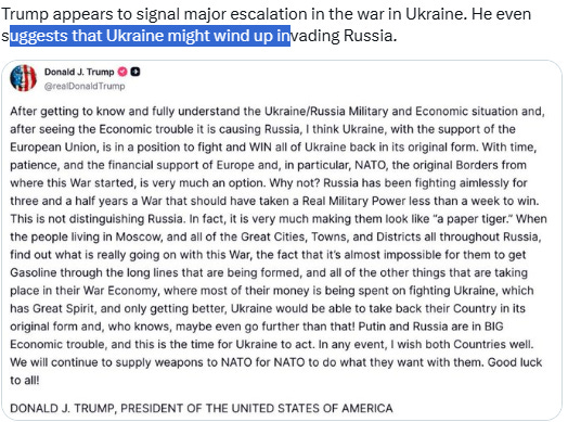 Trump’s surprise U-turn claim that Ukraine could win the war against Russia’s invasion seems to be his latest ploy to avoid imposing the “severe consequences” that he promised for his buddy Putin’s obstruction of ceasefire negotiations. [But] it’s all empty talk to divert attention from Trump’s failure to impose the promised “severe consequences” on Putin for refusing to negotiate a ceasefire. EU Kaja Kallas, as her country [Estonia] also got incursion by Russia’s jet fighter, warns Trump that Europe can’t shoulder Ukraine war burden alone.