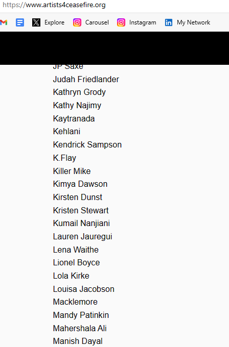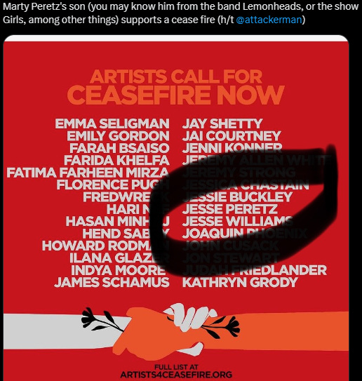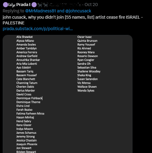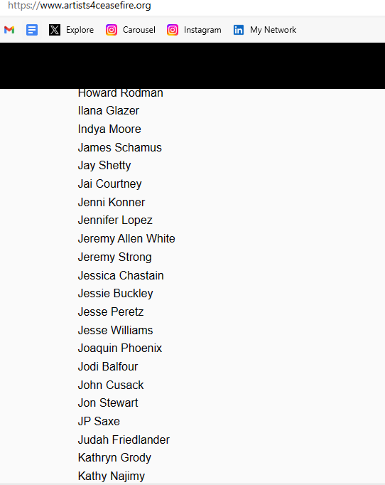 Early list are 55 names [16 of them is Jewish like Jon Stewart], now to be 186 [59 of them is Jewish, including for new name in list - and jew like Jesse Peretz, Mandy Patinkin, etc.] 186 Name rechecked web as of Oct 27th, 2023, 9.12am DC time. On Friday Oct 20, 2023, around 11pm DC time, because John Paul Cusack still active in twitter / X at the moment, I was asked John Paul Cusack because he’s not in list, but now he’s already on this list.