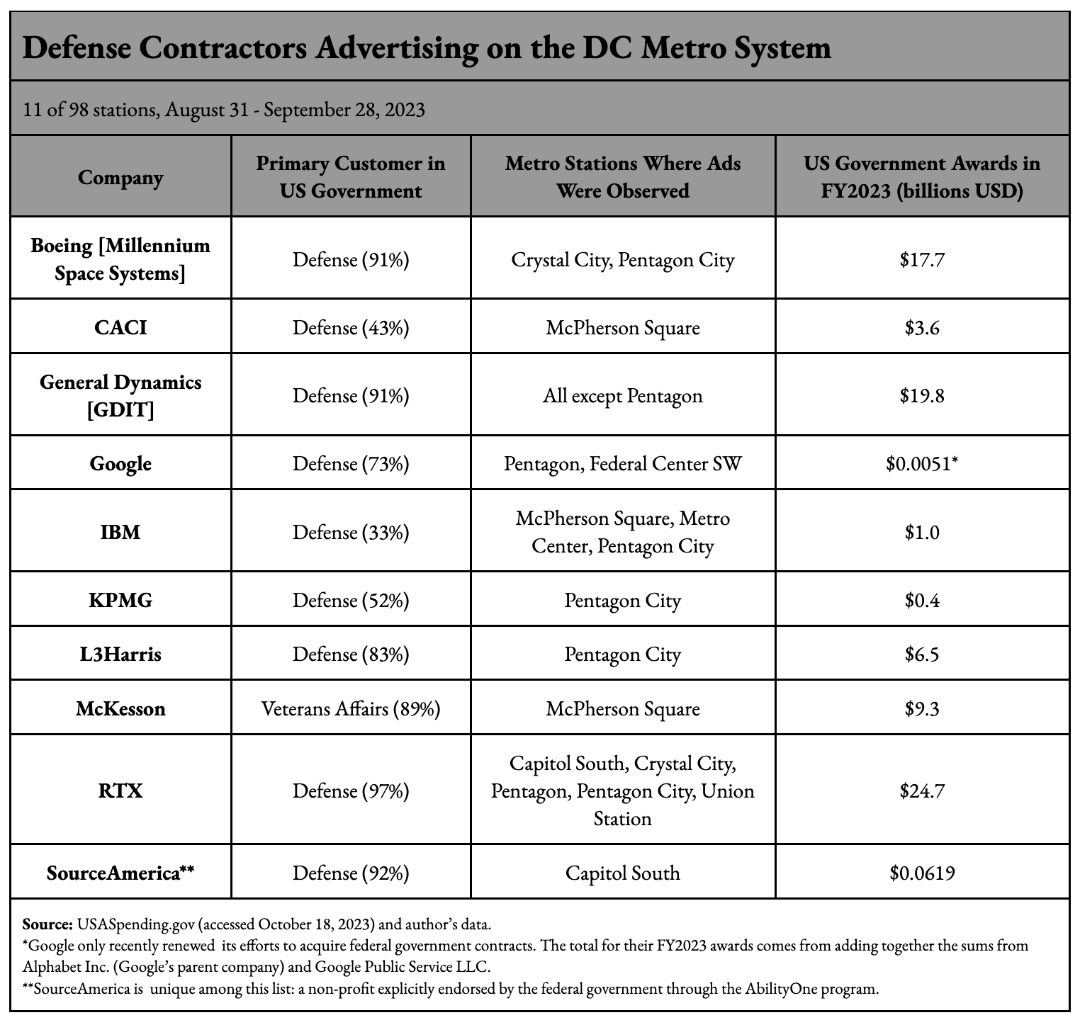 So, I obtained what information I could the old-fashioned way — I rode the Metro, a lot. For five consecutive weeks, I visited 11 WMATA Metro stations and recorded the names of every advertiser. All were located within one mile of major policymaking institutions: Capitol Hill, the White House, the Pentagon, and the State Department.