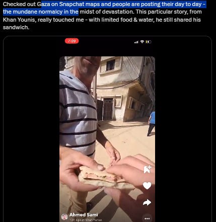 civilians in Gaza. footage via Plestia Alaqad and Ahmed Sami. Sharing food because heinous Israel with weapon from US to block aid for Gazans.