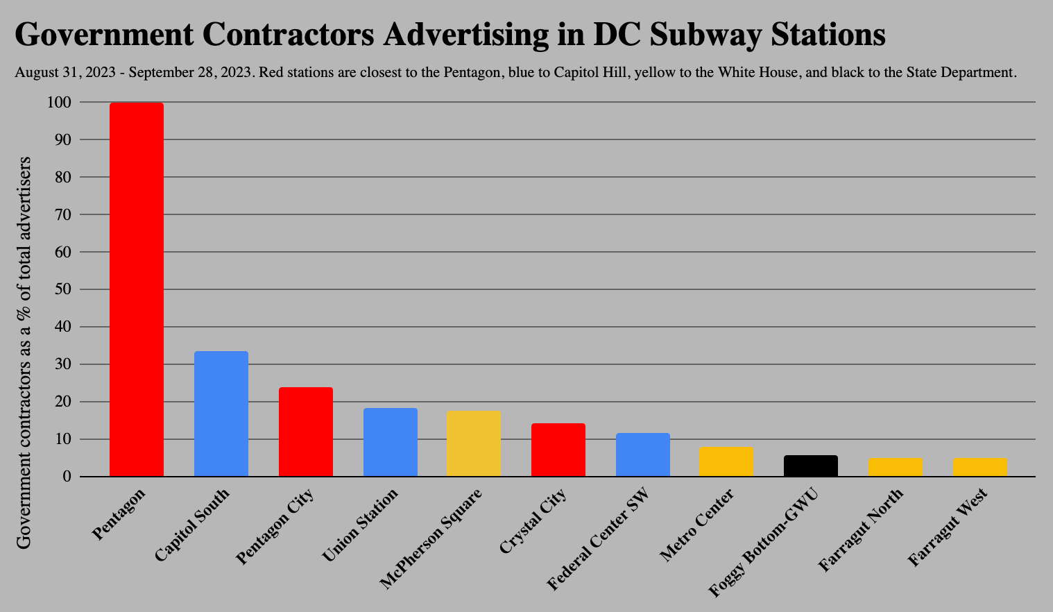 The data suggests that contractors are most focused on targeting the Pentagon and Capitol Hill. Contractors made up just 6% of all advertisers in Foggy Bottom-GWU, the only stop near the State Department. In the four stops around the White House, they averaged 9%. Among the three stops closest to Capitol Hill, this number rises to 21%. In the three stations closest to the Pentagon, an average of 46% of all advertisers were contractors.