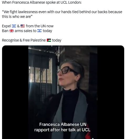 Albanese, the State Department press release noted, had “directly engaged with the International Criminal Court (ICC)” at The Hague “in efforts to investigate, arrest, detain, or prosecute nationals of the United States or Israel, without the consent of those two countries.” And she had “recently escalated this effort by writing threatening letters to dozens of entities worldwide, including major American companies across finance, technology, defense, energy, and hospitality, making extreme and unfounded accusations.”