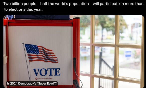 Two billion people—half the world’s population—will participate in more than 75 elections this year. Indonesia - 276 million people and around 209 million eligible voters [February 14th, 2024], India [multiple days, April - May 2024], and United States [November 2024]. Of course, gigantic budget ever [accumulation] multiple election. Don’t forget about European Union. The 2024 European Parliament election is scheduled to be held on 6 to 9 June 2024. This will be the tenth parliamentary election since the first direct elections in 1979, and the first European Parliament election after Brexit.