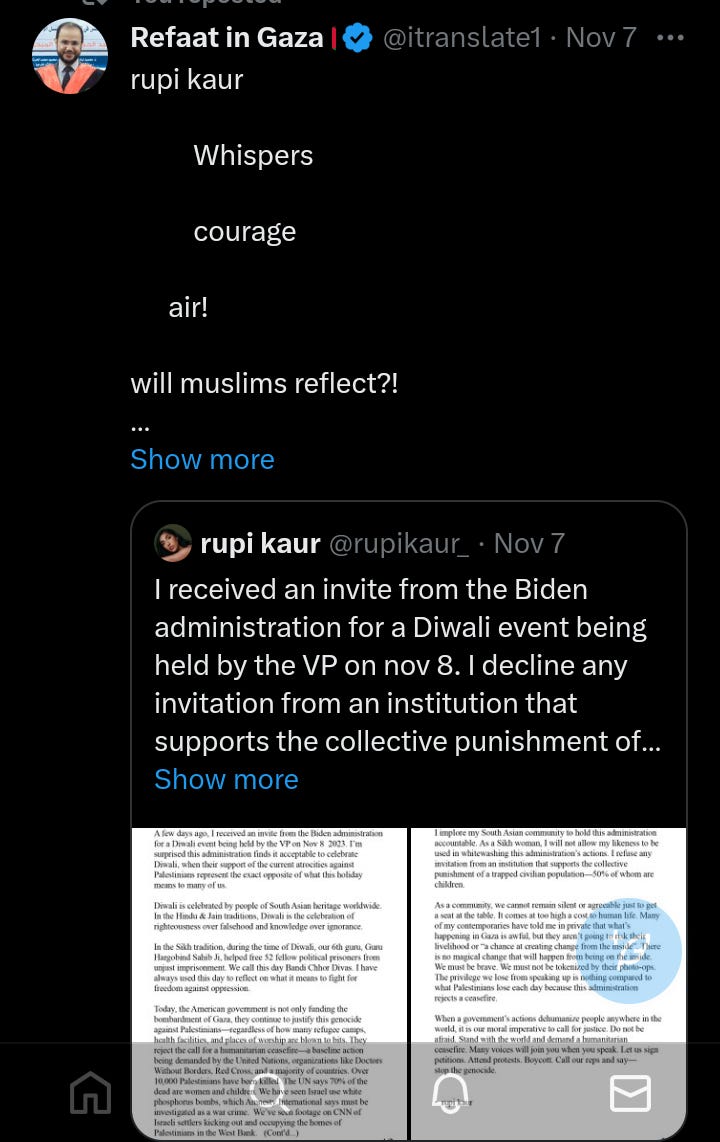 Refaat Alareer after acknowledge that Rupi Kaur refused Divali’s White House party by Biden.