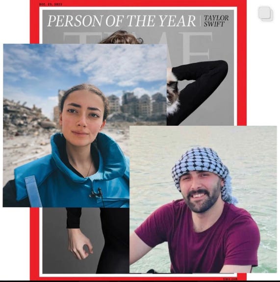 2 Symbol of Gaza. Plestia Bosbos Alaqad and Motaz Azaiza. Both [even[ westernized. Motaz part of UNRWA USA. Plestia is Albert Schweitzer Scholars. As of minute-time, 1.57am Melbourne [Plestia] and 4.57pm Gaza [Motaz]