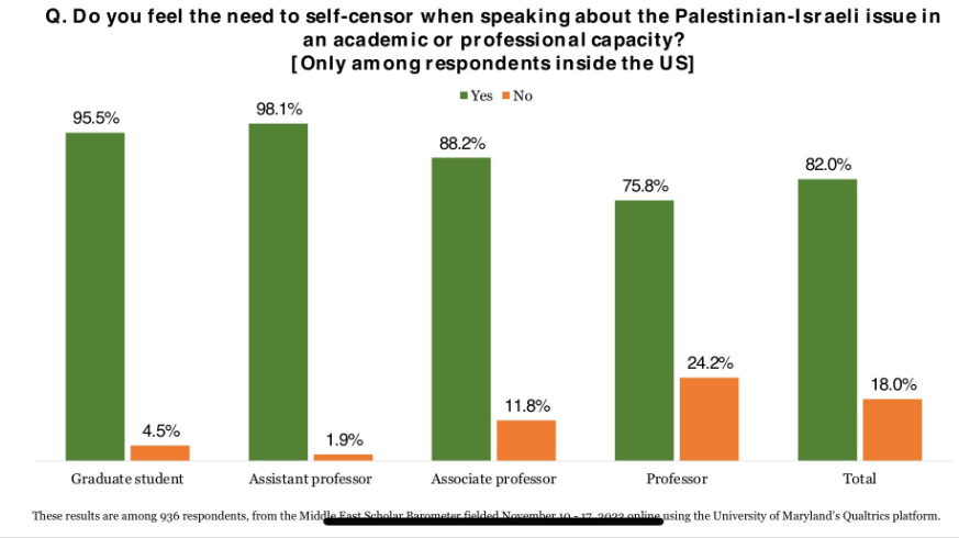 In America, 82% of all U.S.-based respondents, incl. almost all assistant professors (98 %), said they self-censor when they speak professionally about the Israeli-Palestinian issue. 81 % of those said they primarily held back their criticism of Israel vs 11% of Palestinians. Can't possibly imagine why 98% of assistant Profs feel the need to do this.
