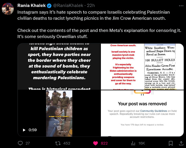 Have any adjustments been made to ordinary Palestinians “expressing their resistance and fury at the invading military forces”? Quite the opposite. In a blog post that was last updated on December 5, Meta stated that it has disabled hashtags, restricted live streaming, and removed seven times as many pieces of content as it did in the two months prior to October for violating its DOI policy.