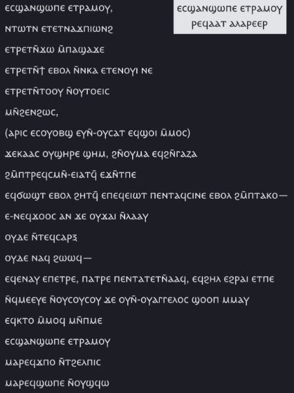Coptic (Bohairic Coptic: ϯⲙⲉⲧⲣⲉⲙⲛ̀ⲭⲏⲙⲓ, timetremǹnkhēmi), in detail Sahidic Coptic / Saidic Coptic ==== twitter [at]pterandydon