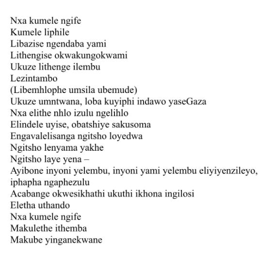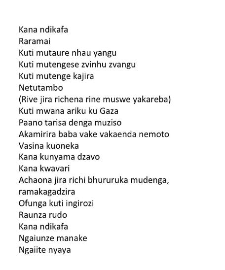 Shona / chiShona / Central Shonic varieties (comprising Zezuru, Manyika, Korekore and Karanga) or specifically Standard Shona in Zimbabwe ==== twitter [at]assata_burner
