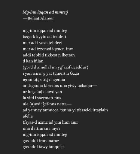 Tamachek / Tamashek / Tamasheq language, variety of Tuareg, a Berber macro-language widely spoken by nomadic tribes across North Africa in Algeria, Mali, Niger, and Burkina Faso ==== twitter [at]Amajagh