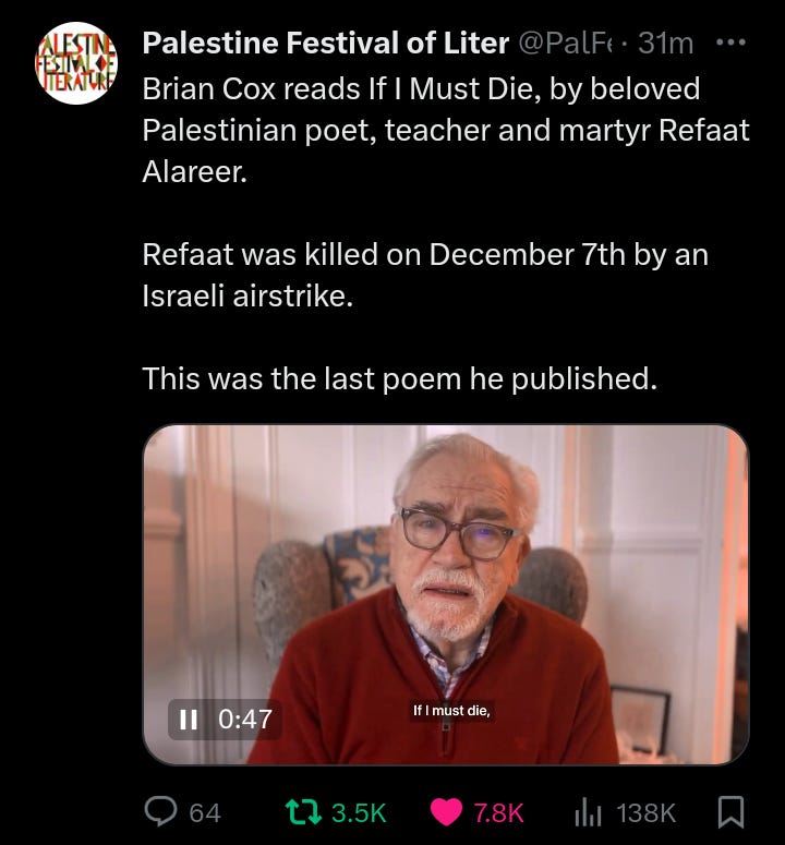 link YouTube Brian Denis Cox CBE [Logan Roy “SUCCESSION”] reads ‘IF I MUST DIE’