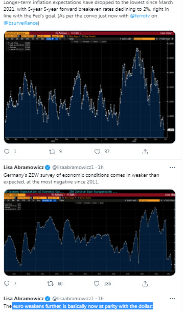 The 'quiet' selloff in corporate credit is coming back and I bet it's going to get a lot noisier than “the brutal loss” (June 13th, 2022) in Wall Street. The percentage of fund managers expecting a stronger economy falls to a new low. Dramatic moves in bond yields show that the world's most important market has a big and repetitive problem. And weakened several currencies across the world.