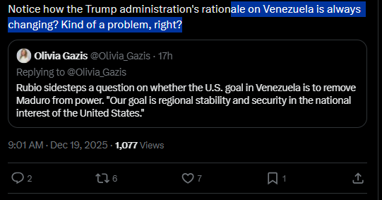 The administration has claimed that the strikes have been on alleged drug boats and that Venezuela is using oil revenue to finance “drug terrorism.”
