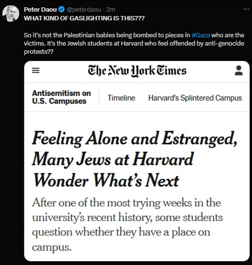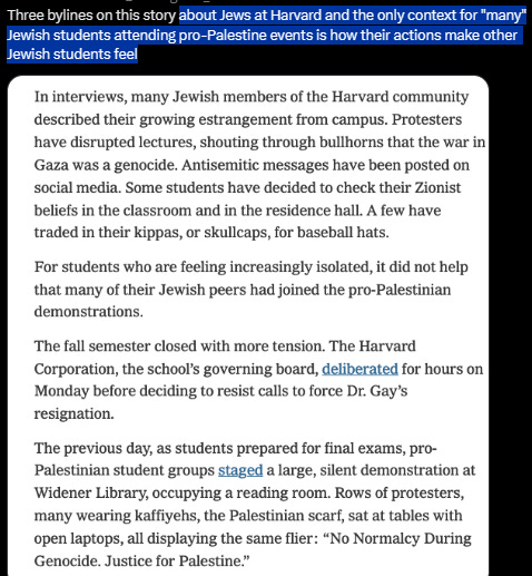 If I was a reporter at the New York Times doing a story about Jews at Harvard, and I heard that "many" Jews were going against the narrative of on-campus organizations, I'd be interested in learning more about these "many" Jews, seems relevant to the story. BUT LOL.