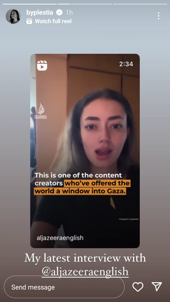I know a lot of high-ranking media, such as New York Times, Guardian, Anadolu, BILD, Spiegel, Financial Times, Strait Times, Washington Post etc subscribed my substack. Plestia ‘Bosbos’ Alaqad ready to be your Stringer or Keynote Speaker or Source about [everything related] Gaza, as Global Opinionator the Washington Post Rana Ayyub Rana Ayyub doing around 69 hours ago or 10 hours ago interview with Egyptian activist Zein Rahma, please contact Plestiaa2011@gmail.com or collab@plestiaalaqad.com