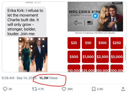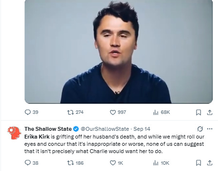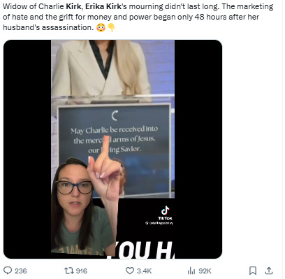 Erika Kirk is weird af for weaponizing her husband’s death to sow more hate and discord in the name of being Christian. For more than a half-century, American political widows honored their slain husbands with a veiled and mostly silent stoicism. In the span of a week, Erika Kirk has radically reconceived that role.