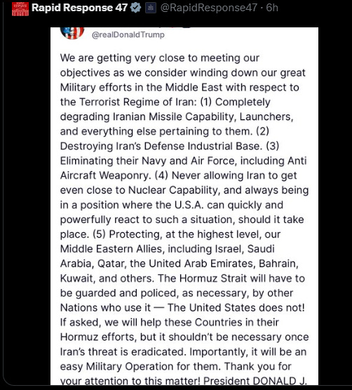 This sounds like a very, very, very far distance from “unconditional surrender,” but if Trump wants to declare victory and pretend that something important was accomplished so that he can pull out, the sooner the better. Let him throw a parade for himself if that will help. Trump appears to be setting the stage for US withdrawal and leaving local states the task of reopening the Strait of Hormuz. Think of it as a new Trump Doctrine for the Middle East: "We broke it but you own it." There are no good policies left for US (at least none that Trump would follow) and this would be the best of bad options available. Anonymous US officials running to the press to distance themselves from a deeply unpopular war in a transparently self serving manner that is not paired with any material policy changes? The Brandonization of Trump continues unabated
