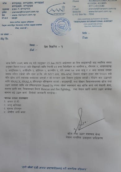In January, an airline crash happened again. A 72-seater Yeti Airlines (a Nepal flagship) ATR72 aircraft crashed at Pokhara International Airport (between old domestic airport and International Airport) in Nepal. Rescue operations are underway and the airport is closed for the time being. A total of 68 passengers and four crew members were on board. Plumes of smoke can be seen engulfing the area, no clarity on survivors as of now. The recent crash makes 28 fatal air crashes in Nepal in 30 years.